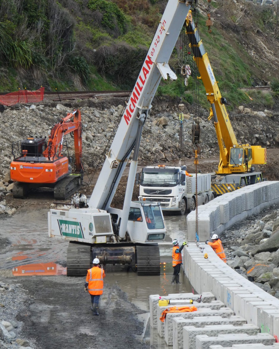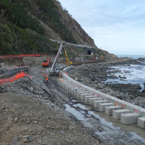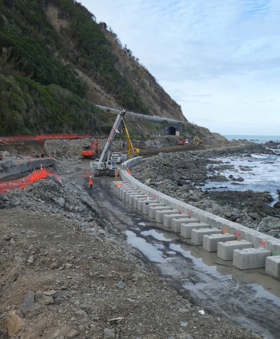 Many of the seawall foundations sit under the high tide mark, with changes in sea levels the design allows for future retrofitting for extra height if needed. With a design life cycle of 100 years, the seawall will offer sustainable protection to the road and rail system along this rugged coastal route.