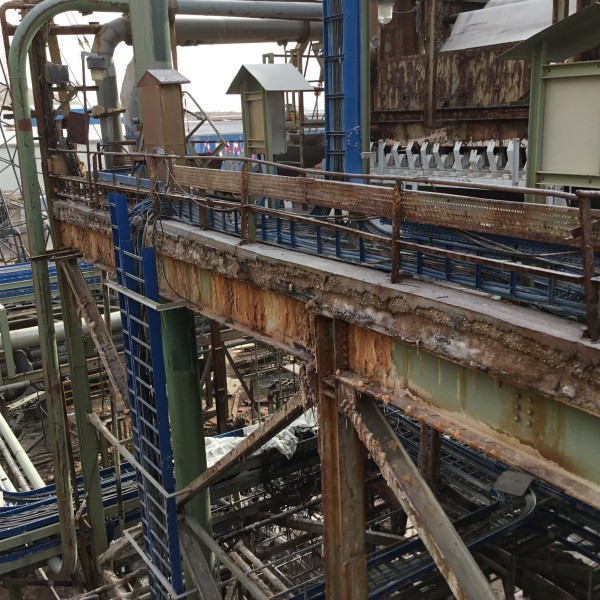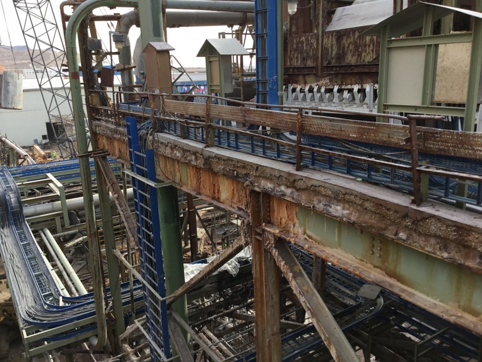 The materials used to produce potash combined with the processes encourage advanced deterioration in concrete and supporting frames. Exposure to hot leach product (HLP) led to advanced deterioration of the concrete slab and supporting steel framing. This also led to early onset of corrosion on the concrete surface paste and embedded reinforcing steel. Supporting steel beams, columns, and bracing members also exhibited localized corrosion.